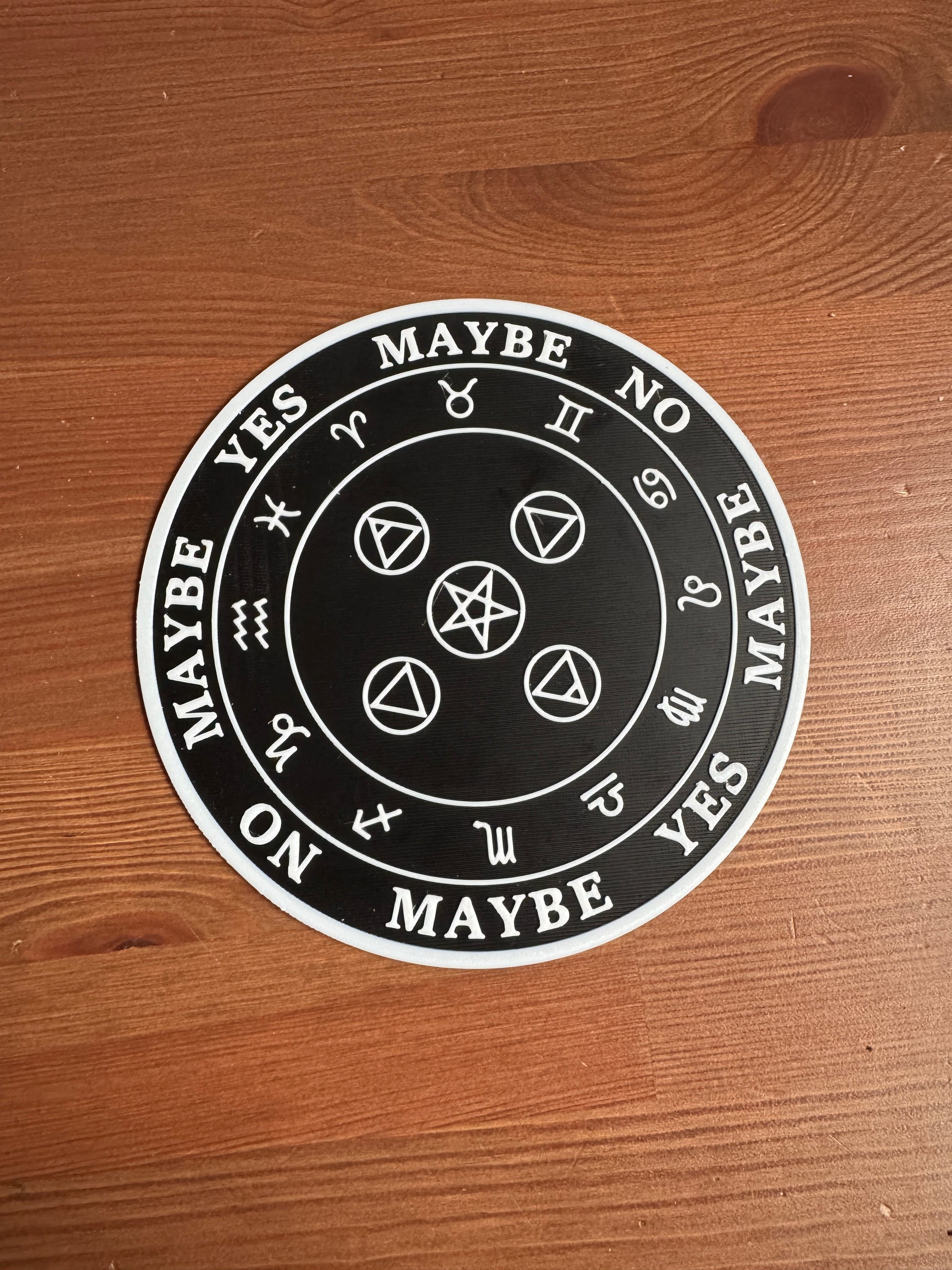 Dieses elegante Pendelbrett vereint mystisches Design mit moderner 3D-Drucktechnik. Mit seinem Durchmesser von 15 cm ist es perfekt handlich und eignet sich ideal für spirituelle Rituale, Energiearbeit, Entscheidungsfindung oder intuitive Meditation.